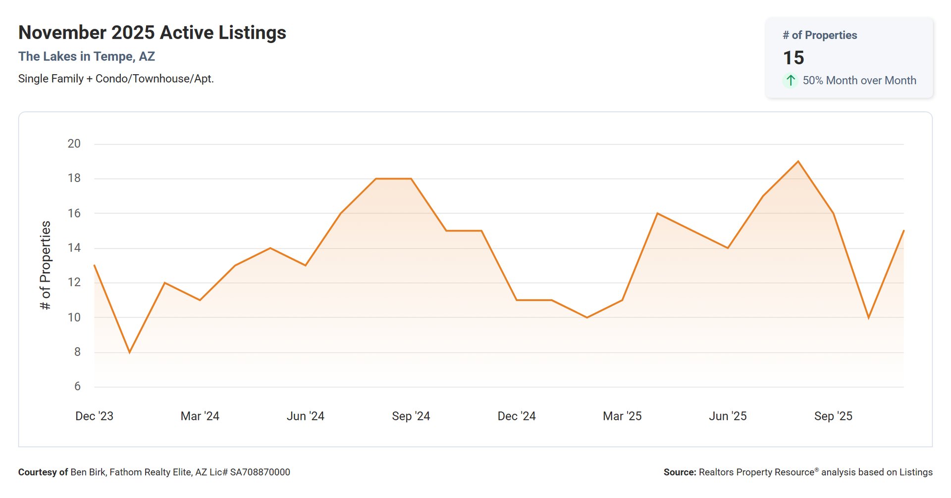 Inventory in The Lakes picked back up from 10 active listings in October to 15 in November. Six of the fifteen active listings are condos and townhomes and the median days on market in The Lakes is 72 days on market.